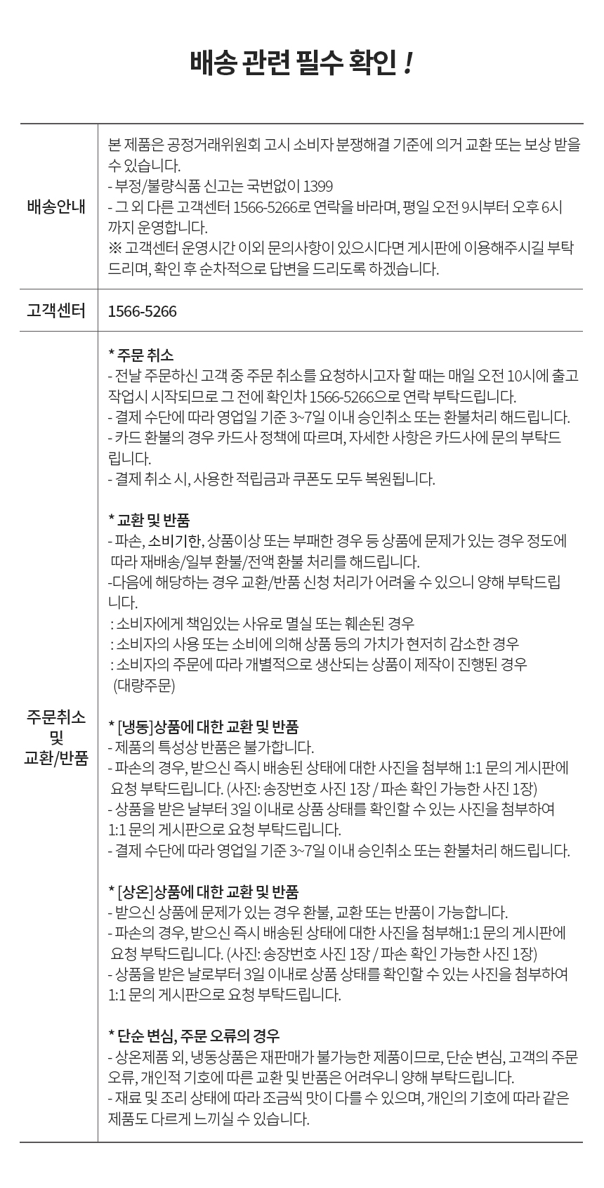 - 전날 주문하신 고객 중 주문 취소를 요청하시고자 할 때는 매일 오전 10시에 출고 작업시 시작되므로 그 전에 확인차 1566-5266으로 연락 부탁드립니다.